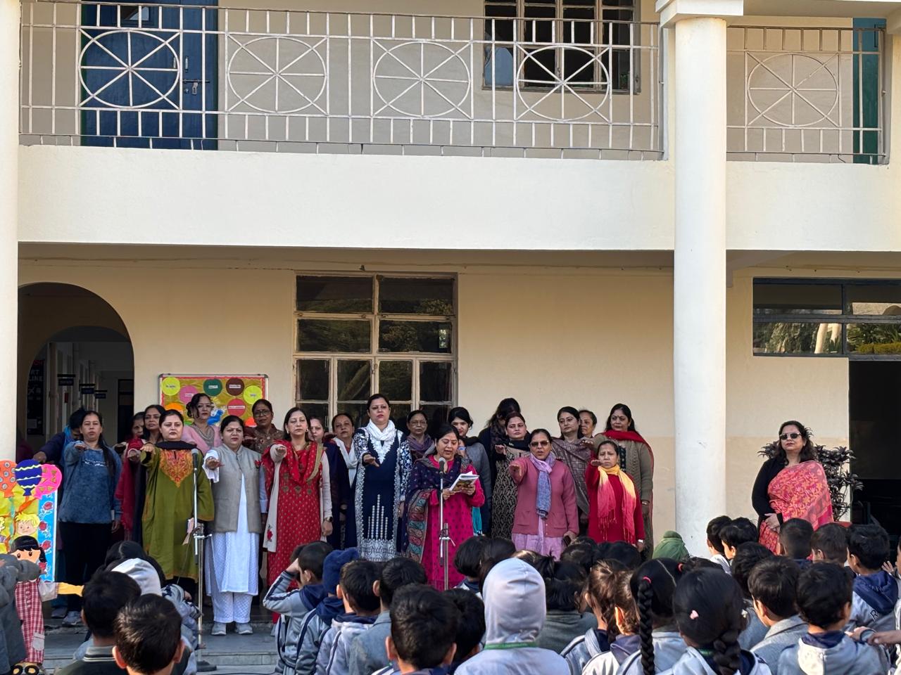 To add charm to the celebration, the Kindergarten teachers presented a delightful role play, after which the children joyfully released colourful balloons into the sky. The assembly continued with a melodious choir performance by the teachers, singing “Bum Bum Bole”, filling the atmosphere with energy and joy. A special Children’s Day pledge was administered, reminding students of their responsibilities and values. The Head Boy and Head Girl of the Primary Wing delivered a heartfelt vote of thanks. The assembly concluded with the Principal’s address, where she encouraged students to make the most of every learning opportunity. The assembly ended on a patriotic note with the National Anthem.