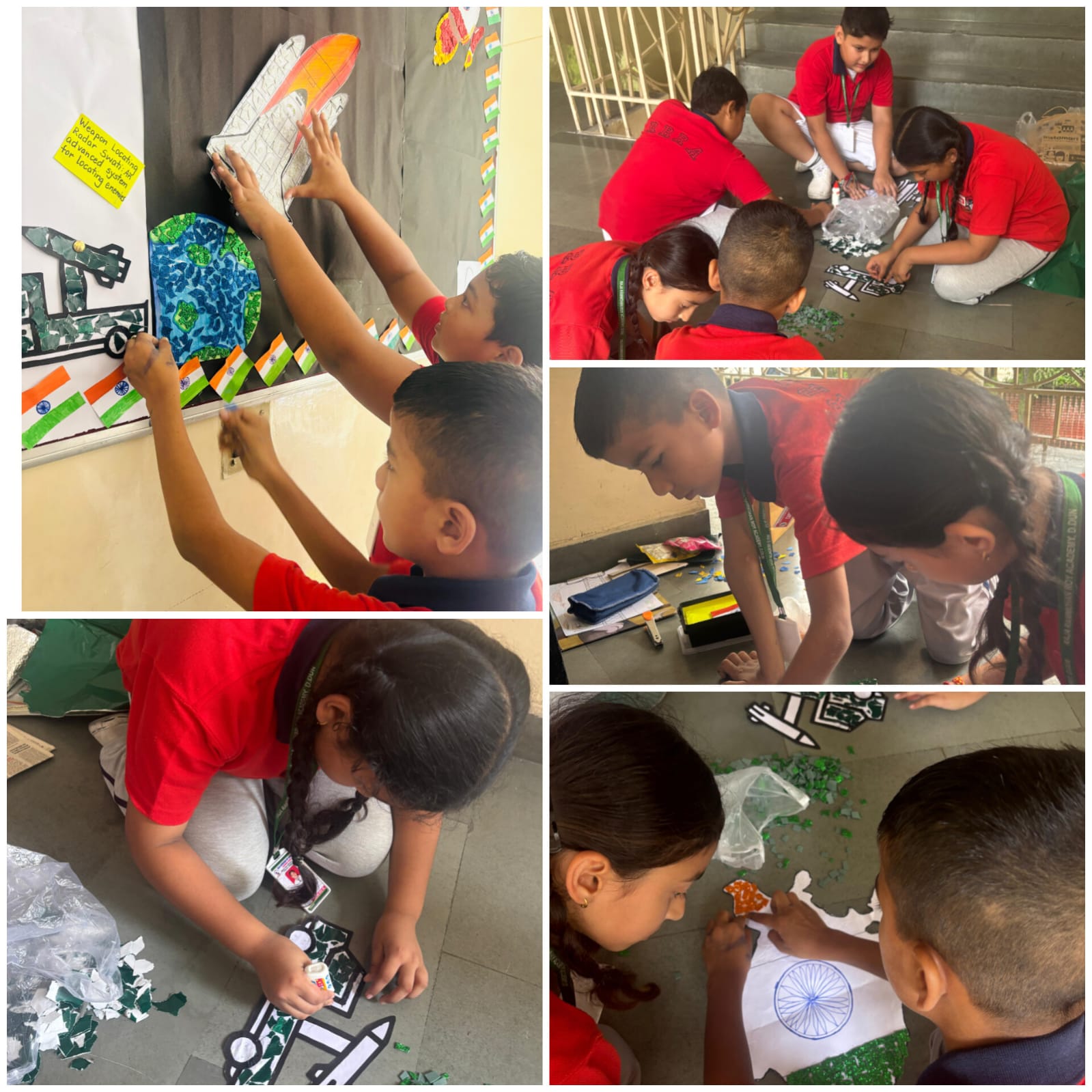 The Inter-House Tear and Paste Collage Making Competition was held in the Primary Section on Saturday, 23rd August 2025. Five students from each house participated with great enthusiasm, creating collages on the given themes: