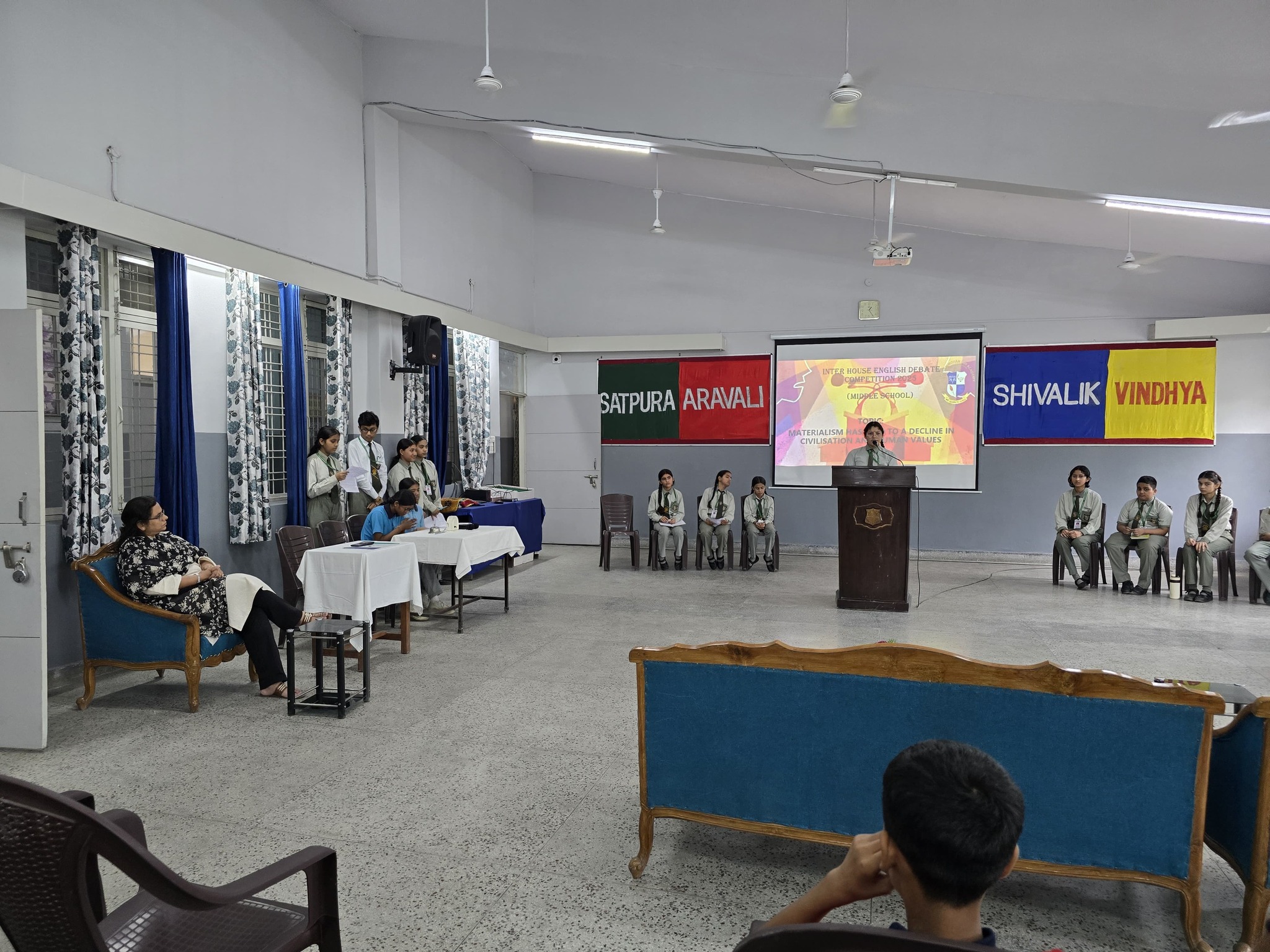 The Principal, Ms. Bharti Vishnoi, addressed the gathering, appreciating the hard work of the participants and encouraging them to continue developing their communication and critical thinking skills.