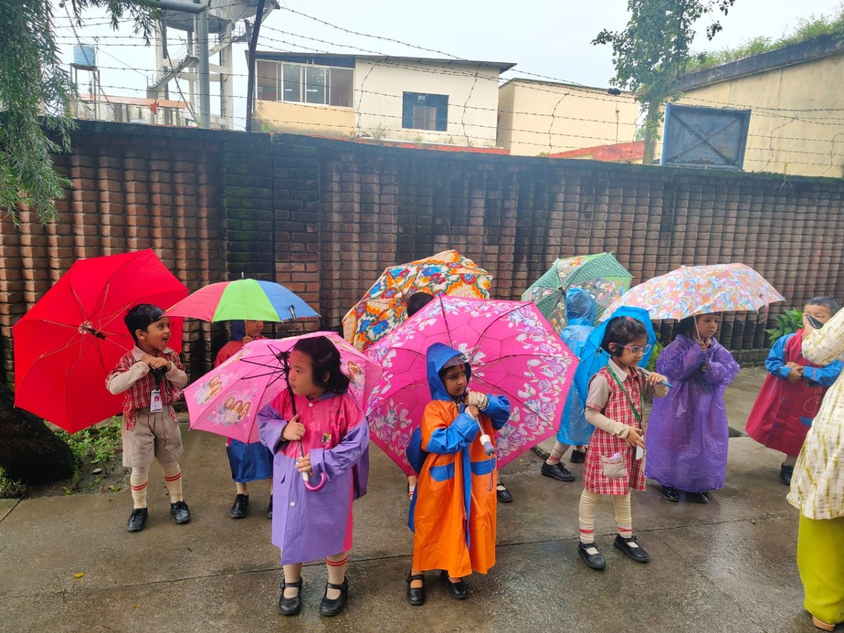 The Monsoon Season Activity was organized on Friday, 29th August 2025, at Raja Rammohan Roy Academy for the students of Nursery, LKG, and UKG. The children were introduced to the monsoon season through an engaging and interactive session where they learned about different things associated with the monsoon such as clouds, rain, frogs, earthworms, snails, umbrellas, raincoats, and gumboots. Adding to the fun, children came dressed in colourful raincoats and gumboots while carrying umbrellas. They relished delicious boiled corn cobs and also participated in a creative craft activity based on the monsoon theme. The children had a great time participating in this exciting, joyful, and educational activity.